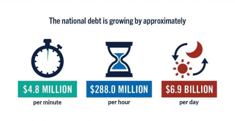 图源:彼得·彼得森基金会官网图片显示,美国国债每分钟增长480万美元,每小时增长2.88亿美元,每天增加69亿美元。