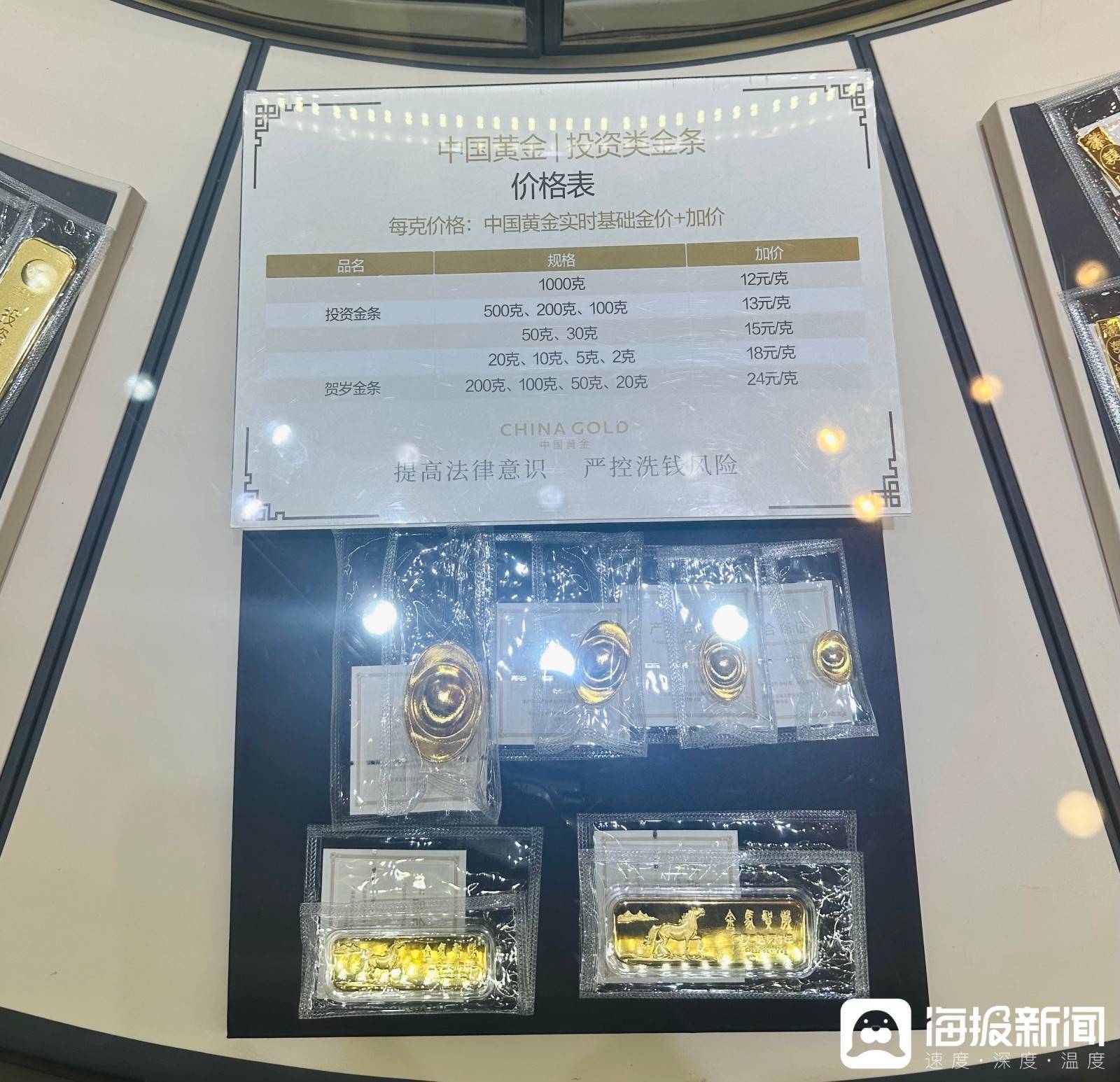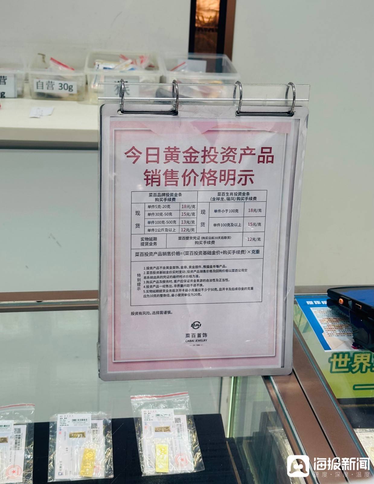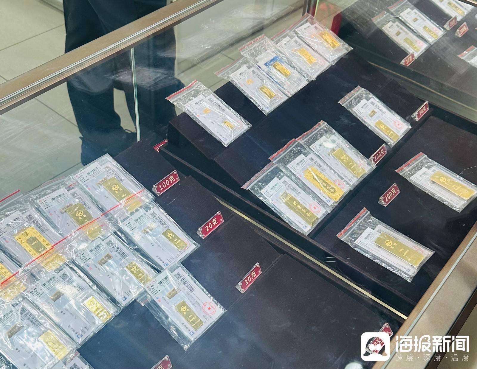 “20克投资金条价格多少?”“有没有生肖投资金条?”3日上午,记者来到拥有“中国黄金第一家”称号的北京菜市口百货股份有限公司(简称“菜百”)。记者在其四层看到,多款不同克重的投资金条被放置在玻璃柜台内,不时有消费者前来咨询、选购。