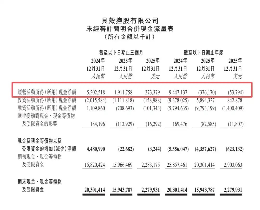 北京时间2026年3月16日,贝壳控股发布2025年Q4及全年业绩公告。从最表层的数字看,这份财报尚在可接受的范围内:全年净收入946亿元,同比增长1.2%,收入端基本守住;净利润29.91亿元,同比下滑26.7%;经调整净利润50.17亿元,同比下滑30.4%;经营活动现金净流出3.76亿元,而2024年同期这一数字是净流入94.47亿元。